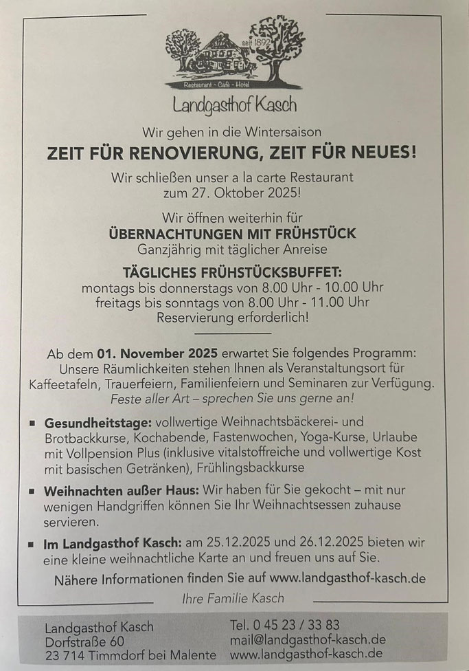 Melden Sie sich bitte im Landgasthof Kasch an, unter 04523 - 3383 - auch für Fragen.